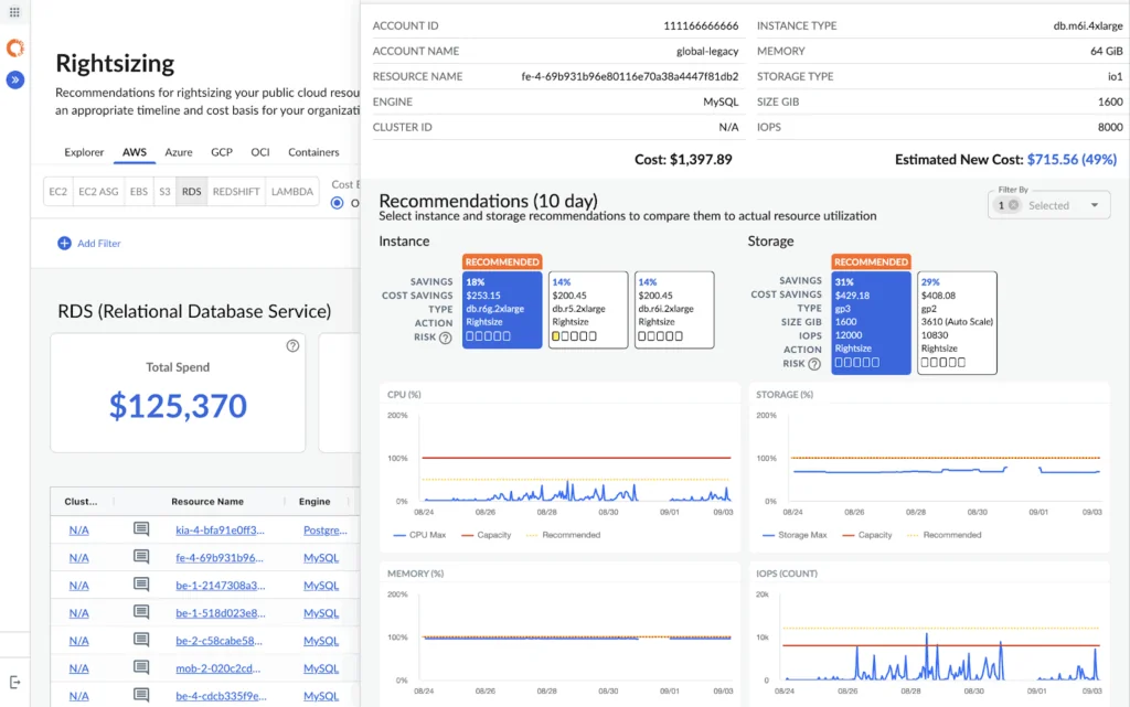 - AWS cost and resource optimization: Offers actionable rightsizing recommendations, lifecycle management for reservations and savings plans, and visibility into container resource utilization.