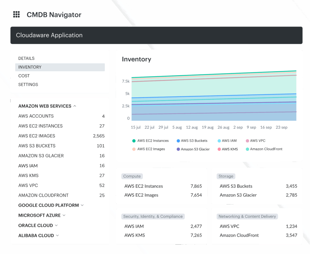 - Unified asset inventory: Consolidates CIs across AWS, Azure, Google Cloud, VMware, Kubernetes, and on-premise environments