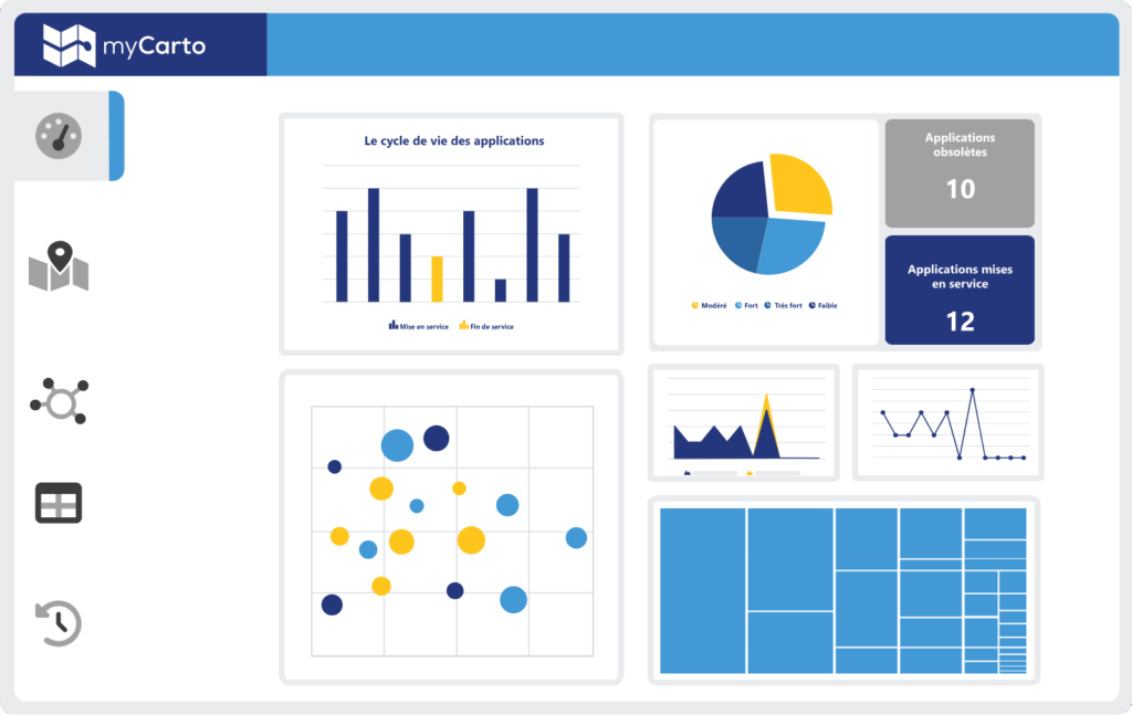myCarto is an enterprise architecture and information system mapping solution intended to give organizations a multi-layered view of their IT environment. It models the relationships between business processes, applications, data flows, infrastructure, and organizational entities.