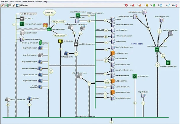 - Monitoring with color-coded statuses: The software continuously monitors devices, interfaces, and applications using SNMP and other protocols. Status updates are displayed on the map using color-coded indicators.