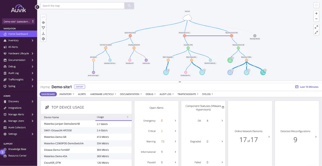 Auvik is an IT mapping tool that focuses on delivering fast, automated network discovery and multi-layer visualization. Within an hour, Auvik can auto-discover network components using standard protocols like SNMP, CDP, and LLDP, generating topology diagrams across physical (Layer 1), data link (Layer 2), and network (Layer 3) layers.