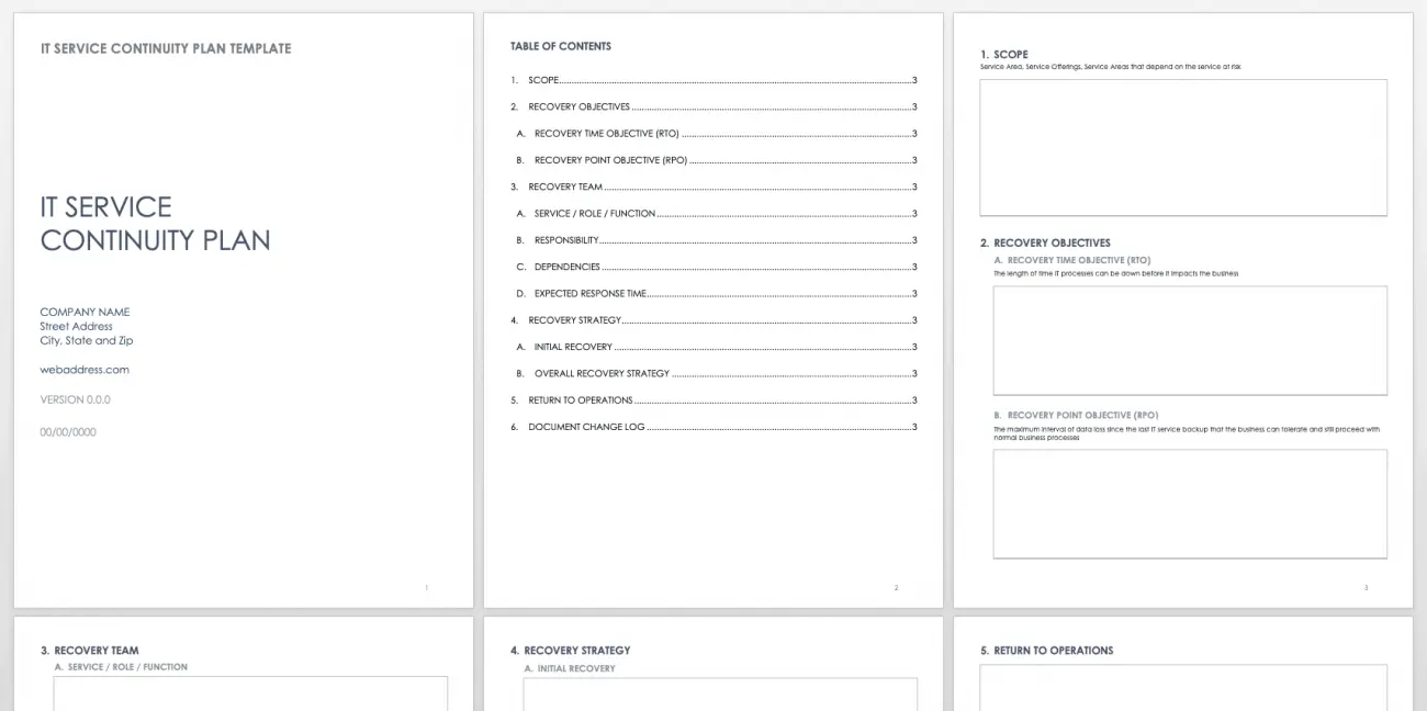 Designed specifically for IT operations, this template ensures that IT processes are maintained during harmful disruptions. It helps document recovery objectives, assign roles to recovery teams, and outline strategies for continuity. Available in Word and PDF formats, this template provides a focused approach to IT service recovery and aligns with broader continuity objectives.