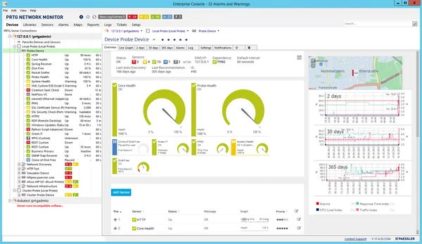 Paessler PRTG is an IT infrastructure monitoring platform that enables organizations to track the health, availability, and performance of networks, servers, applications, databases, and cloud services. It offers preconfigured sensors for common protocols such as SNMP, WMI, and HTTP, as well as custom monitoring through SQL queries and API integration.