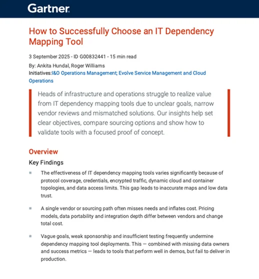 Gartner, How to Successfully Choose an IT Dependency Mapping Tool, by Ankita Hundal, Roger Williams, 3 September 2025. Gartner is a trademark of Gartner, Inc. and/or its affiliated.