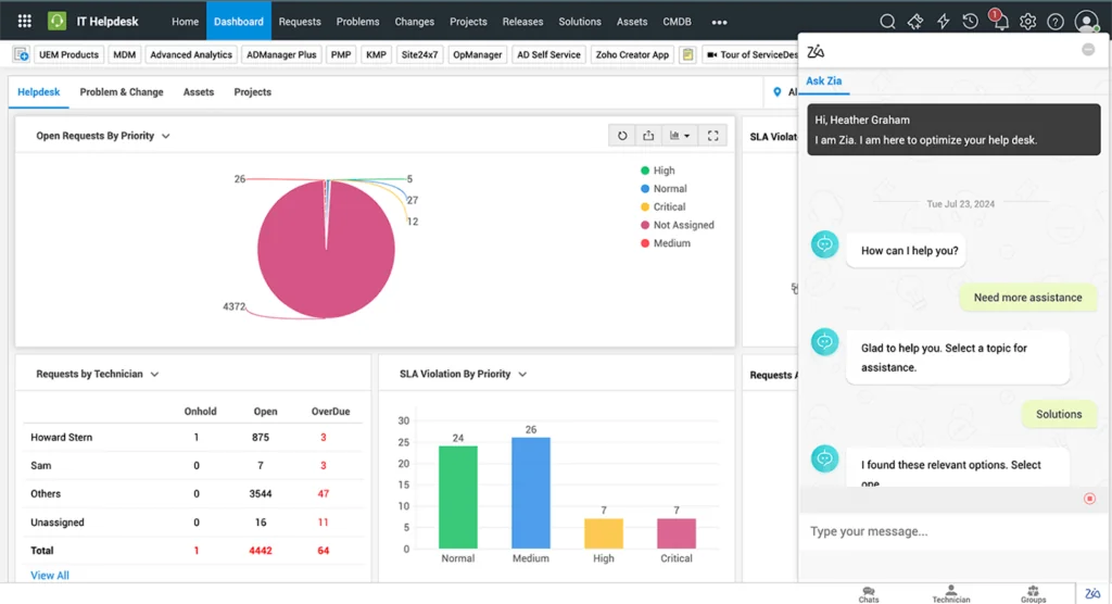 - Virtual support agents: Provides text and voice-based assistance through Zia, the platform’s AI-powered agent.