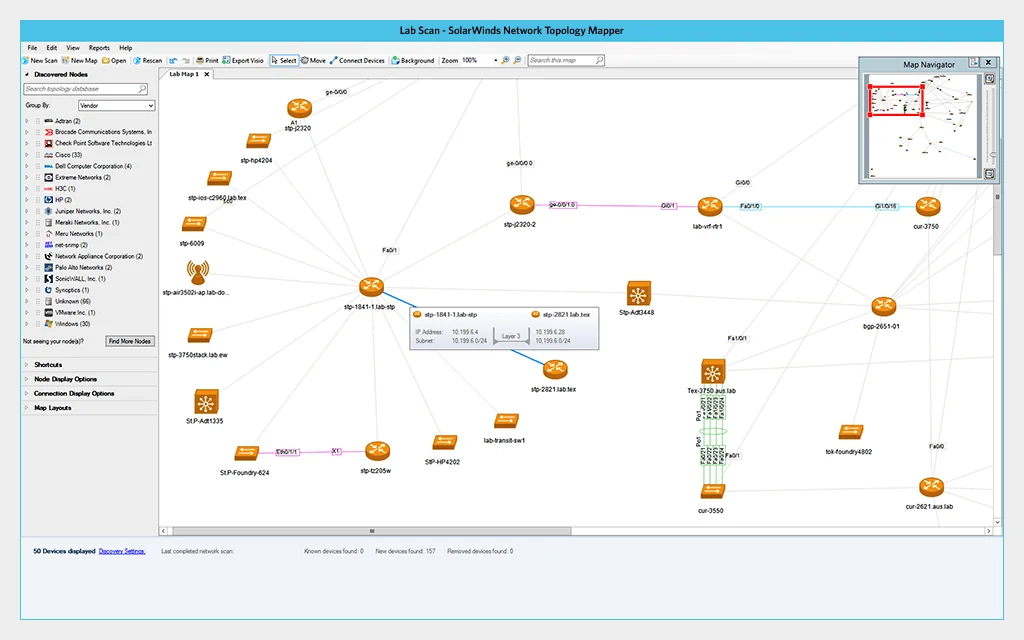 - Automatic discovery: Identifies network devices and topology using CDP, FDP, LLDP, OSPF, BGP, SNMP, and ARP.